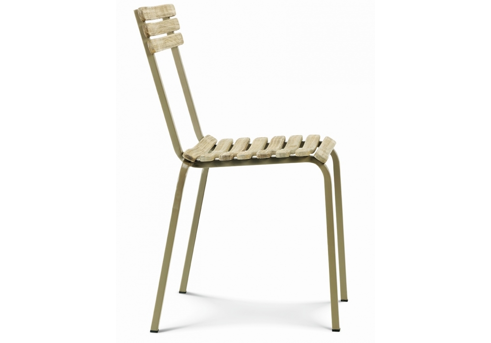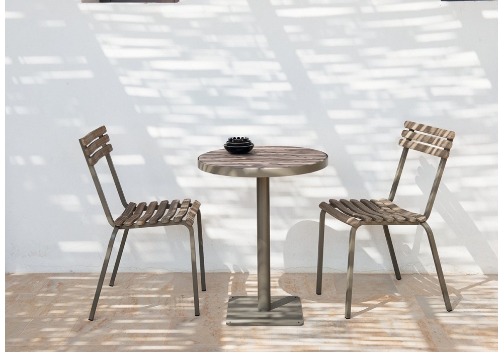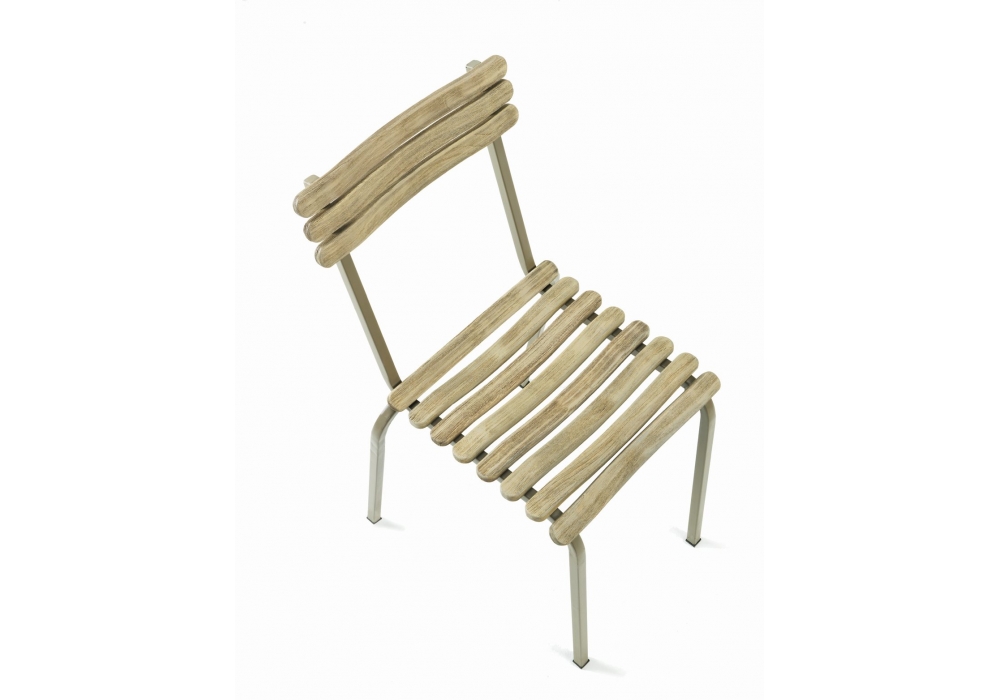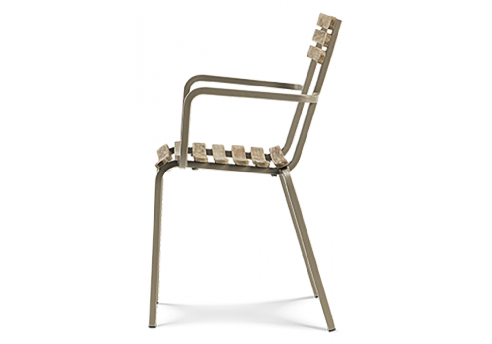 Laren conçue par Ethimo est une chaise empilable pour l'extérieur avec structure en aluminium et teck. Disponible avec ou sans accoudoirs.