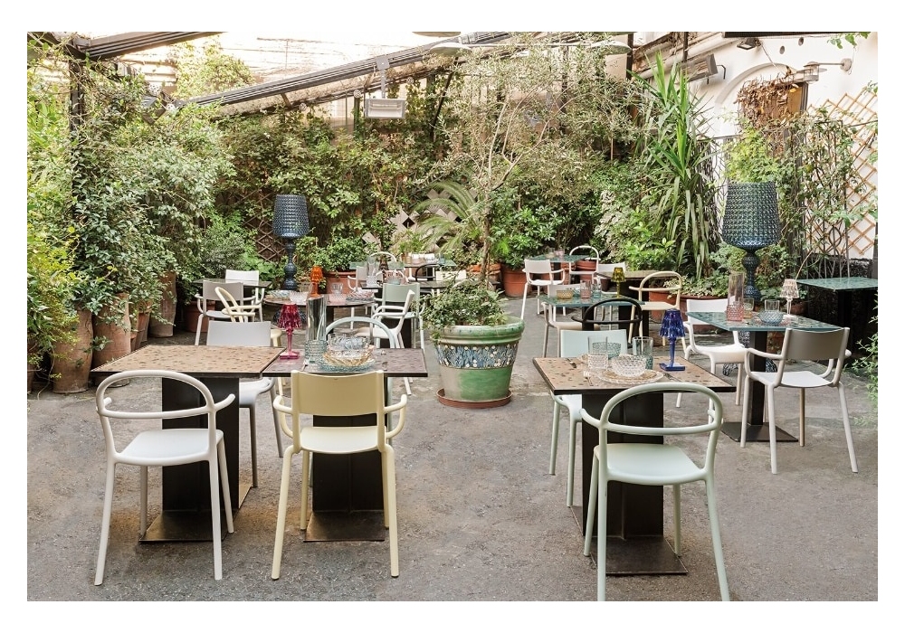 Generic A conçue par Philippe Starck pour Kartell est une chaise avec accoudoirs en polypropylène. Disponible en différentes couleurs.