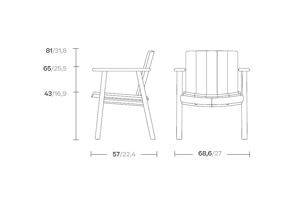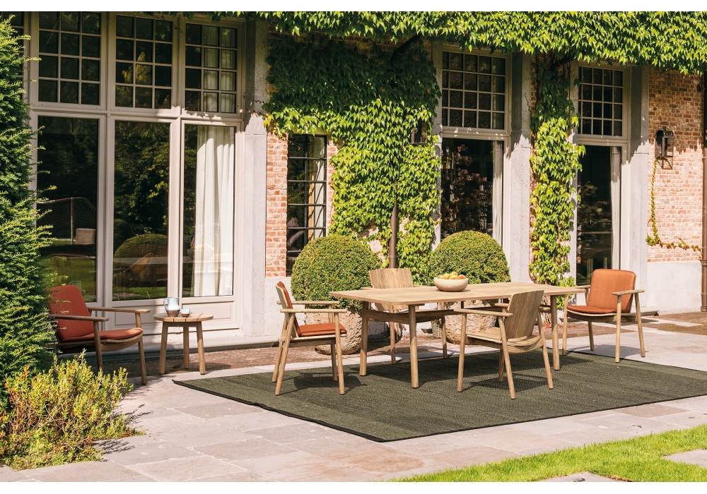 Riva conçue par Jasper Morrison pour Kettal est une chaise de salle à manger avec une structure entièrement réalisée en bois de teck. Les coussins d'assise et de dossier sont rembourrés et revêtus de tissu disponible en différentes finitions.