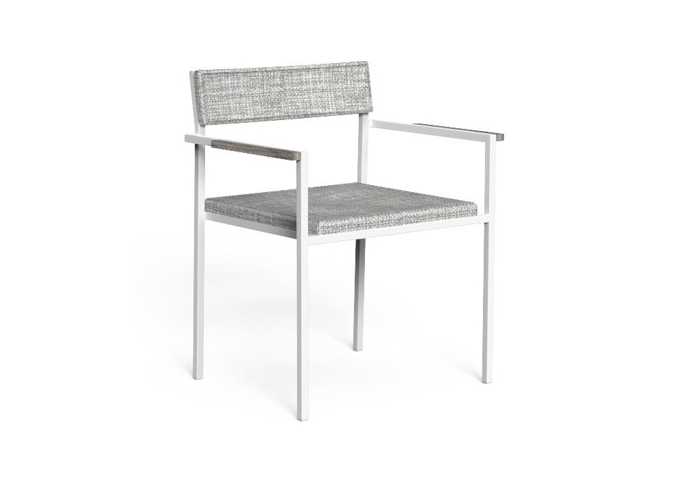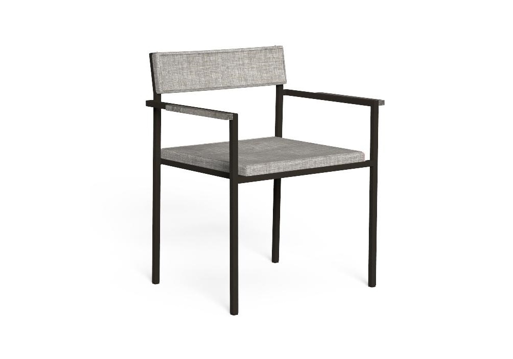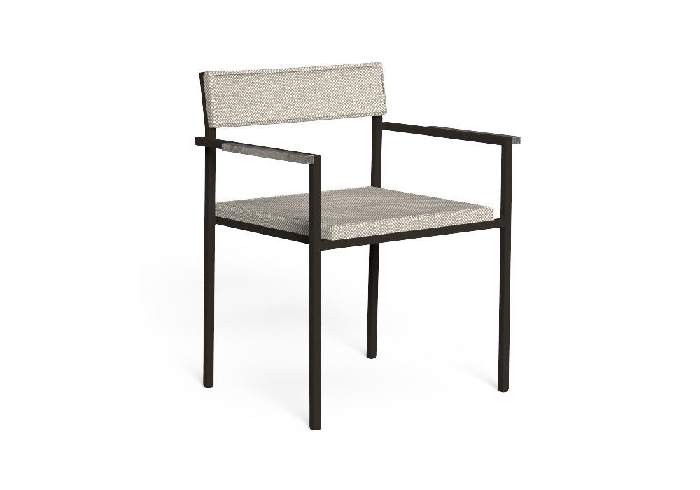 Casilda est une chaise avec accoudoirs par Ràmon Esteve pour Talenti. Composé d'un cadre en métal peint par poudrage, de sangles en polyester le long de la structure, d'un coussin recouvert de tissu et d'accoudoirs en différents matériaux.