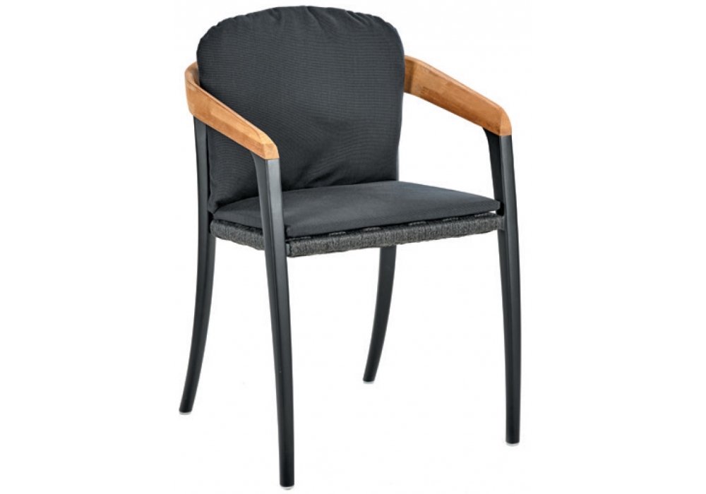 Jive Teak conçue par Kris Van Puyvelde pour Royal Botania est une chaise avec structure en aluminium et teck. Coussins d'assise et de dossier disponibles en différents tissus.