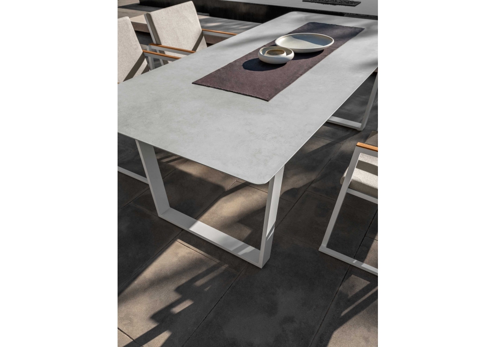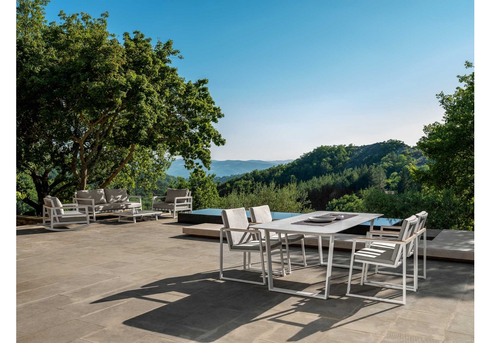 Alabama Alu conçu par Marco Acerbis pour Talenti est une chaise avec structure en aluminium revêtue de poudre et le coussin tissu.