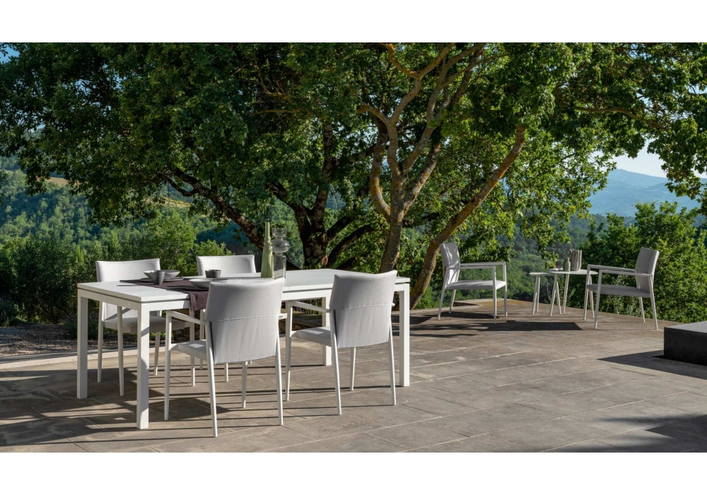 Adam conçu pour Talenti est une chaise avec une structure en aluminium et des coussins en textilène sensible, des matériaux de chaise résistants aux intempéries.