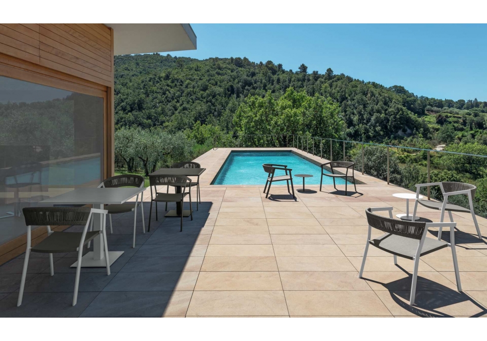 Key conçue pour Talenti est une chaise de salle à manger avec structure en aluminium anthracite ou blanc et housse de siège en textilène.