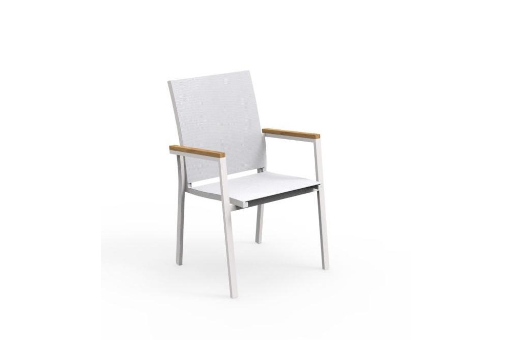 Timber conçu pour Talenti est une chaise avec structure en aluminium en trois finitions, assise et dossier en textilène assorti et accoudoirs en teck. Empilable.