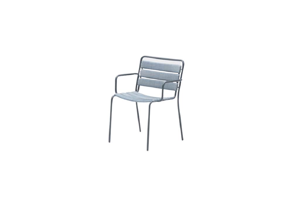 Elba conçue par David Rockwell pour Paola Lenti est une chaise avec structure en acier inoxydable AISI 316 mat peint en graphite ou ivoire. Les lattes sont en Diade recouvertes de tissu Maris dans deux finitions différentes.