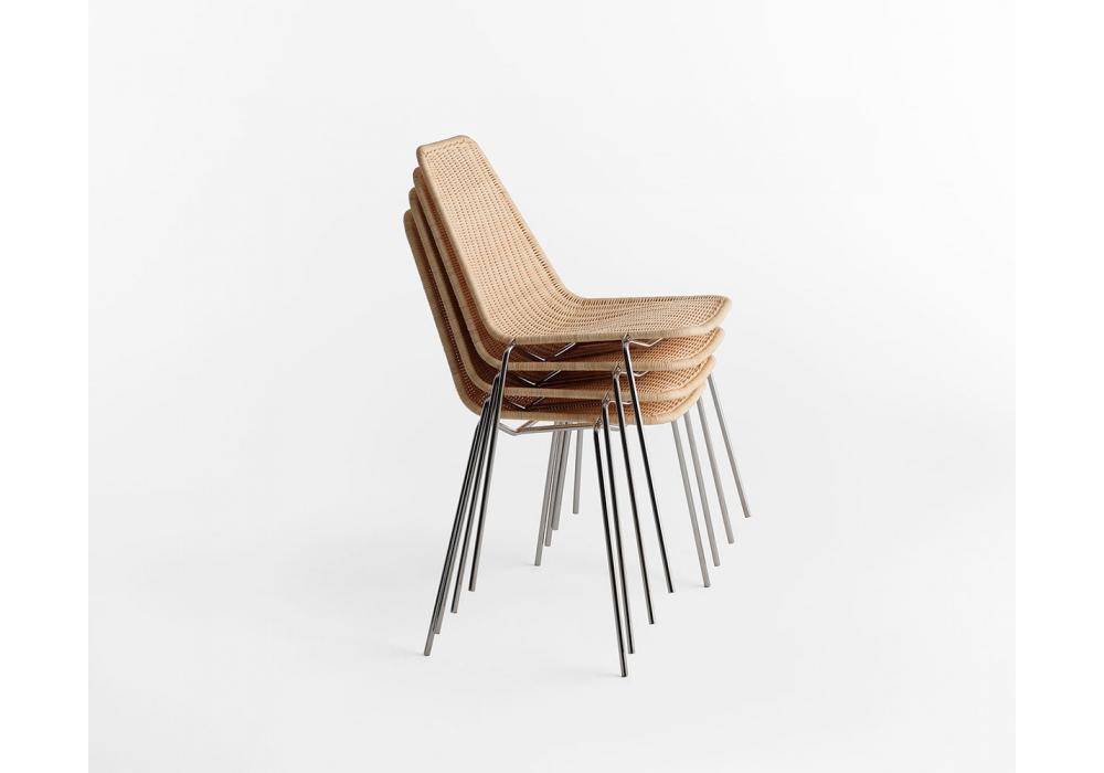 Sin conçue par StH pour Casamania & Horm est une chaise empilable réalisée avec une structure en métal chromé. Assise en rotin naturel non verni tressé à la main.