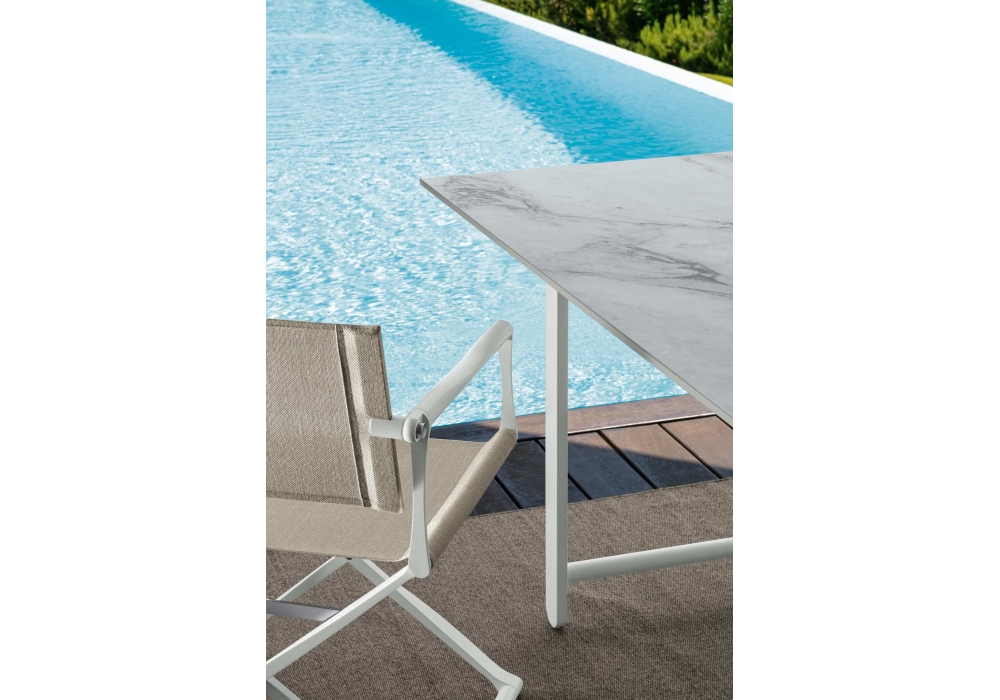 Riviera conçue par Jean Philippe Nuel pour Talenti est une chiase metteur en scène pour l'extérieur. Structure en aluminium thermolaqué, détail de finition en cuir dans le dossier. Les coussins sont déhoussables et recouverts de tissus d'extérieur résistants aux intempéries.