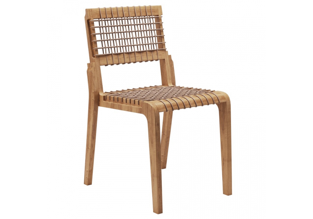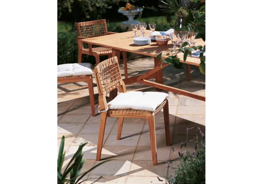 Synthesis produit et conçu par Unopiù est une chaise empilable avec structure en bois de teck naturel et corde tissée waprolace. Les coussins sont en tissu acrylique disponible en différentes couleurs.