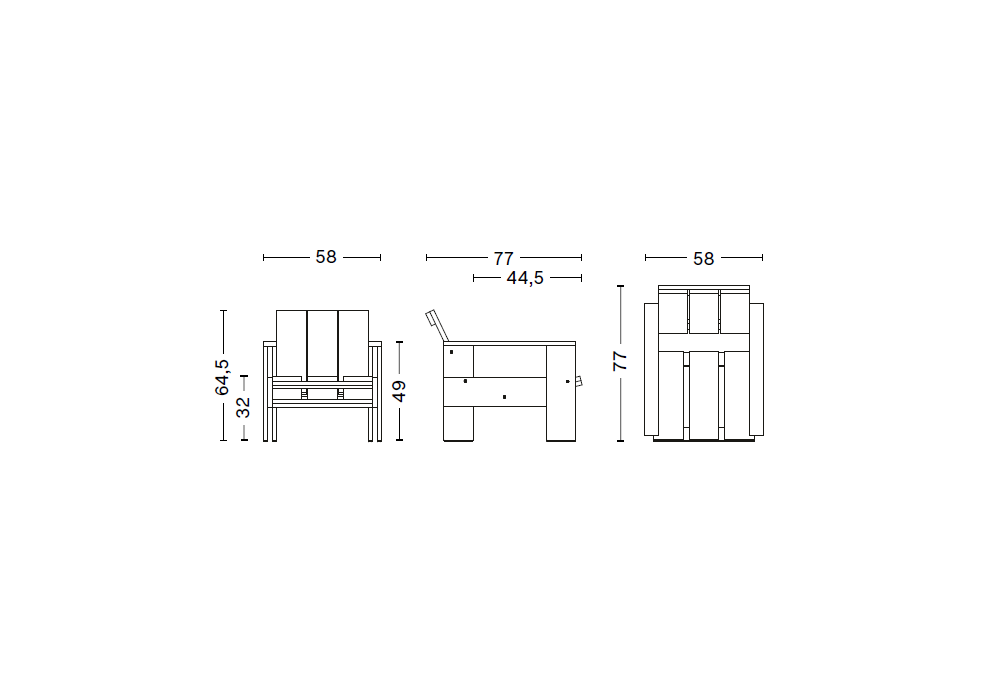 Crate conçue par Gerrit Rietveld pour Hay est une chaise Lounge réalisée en pin Radiata massif laqué à l'eau. Traité avec une laque extérieure 3 couches; un apprêt et deux couches de finition.