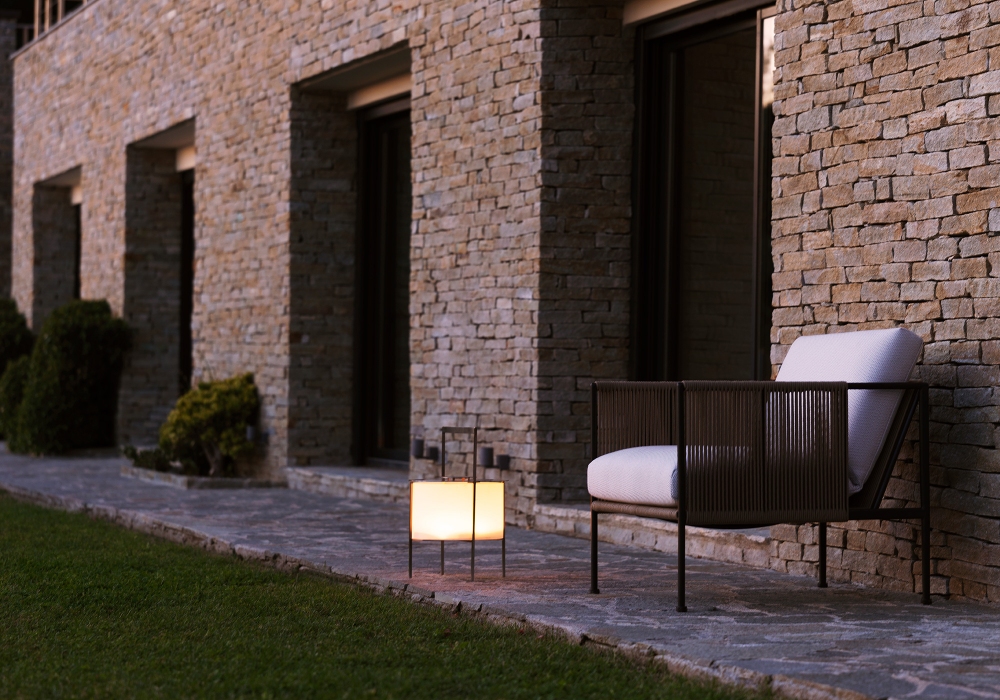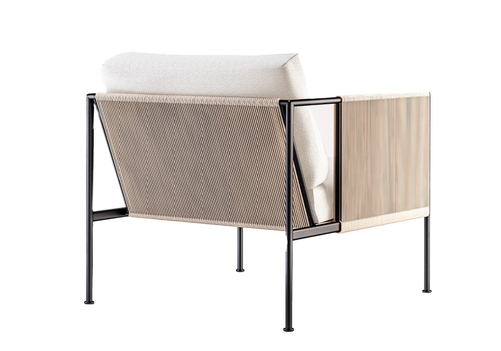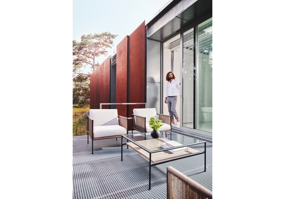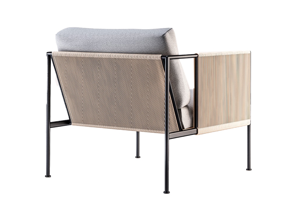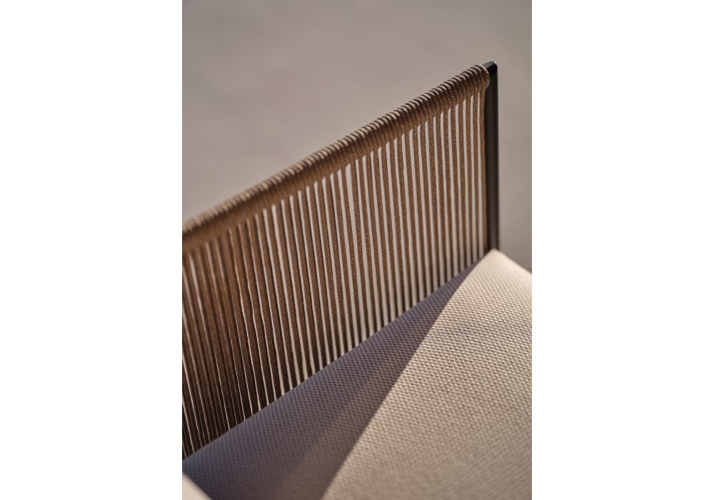 Garden Antibes conçue par Broberg & Ridderstråle pour Röshults est une chaise avec structure en acier inoxydable anthracite avec fil tissé couleur sable dans les accoudoirs et le siège. Le rembourrage est en tissu Sunbrella, un matériau très résistant composé de fibres acryliques avec des pigments ajoutés avant l'extrusion qui sèchent rapidement, empêchant l'accumulation d'humidité, de moisissure et de mildiou.