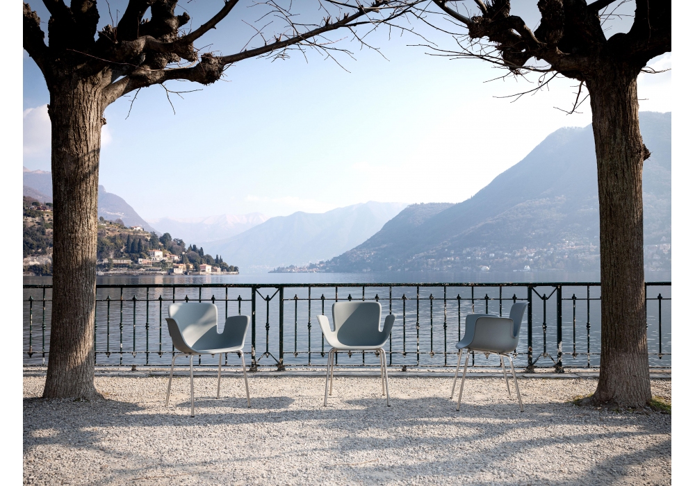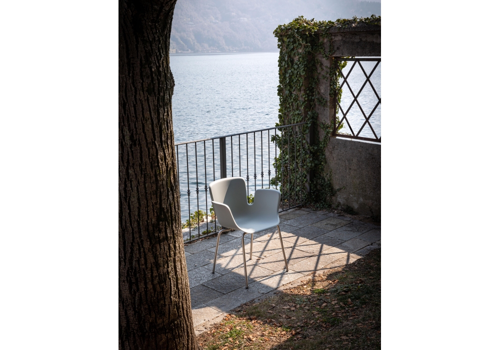 Juli Re-Plastic Lido conçu par Werner Aisslinger pour Cappellini est un petit fauteuil avec accoudoirs adapté à une utilisation en extérieur, composé d'une coque en polypropylène renforcé de fibre de verre recyclé et recyclable et d'une base en acier inoxydable AISI 316.