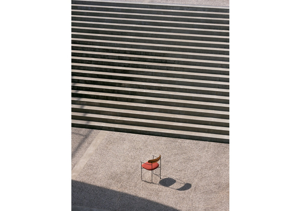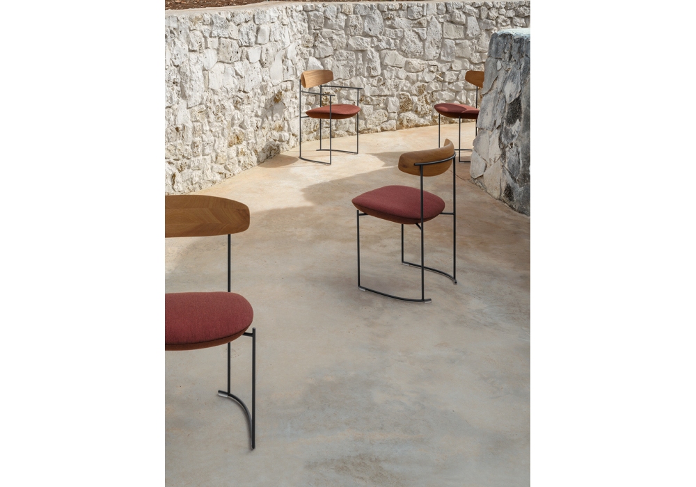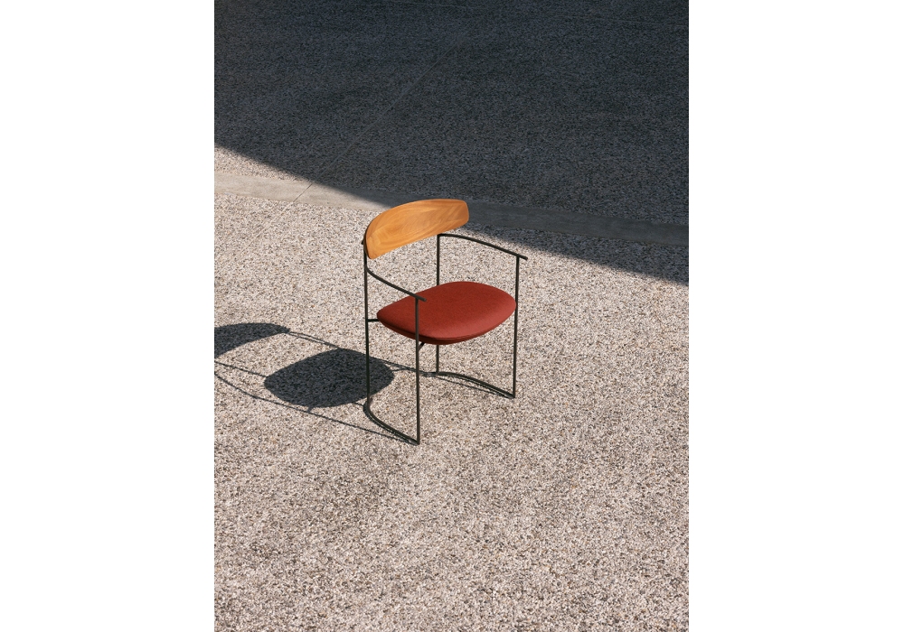 Keel Outdoor conçue par M + V pour Potocco est une chaise d'extérieur avec structure en tige de métal peint en relief, dossier en Iroko massif et assise rembourrée en mousse de polyuréthane ignifuge avec revêtement en divers tissus d'extérieur. Disponible avec ou sans accoudoirs.