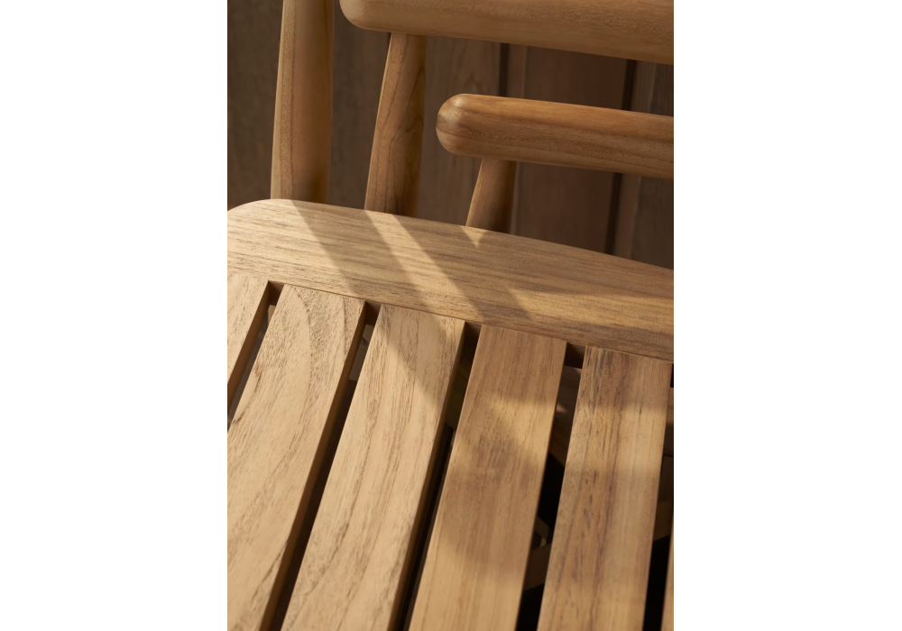 E008 conçue par Eoos pour Carl Hansen & Søn est une chaise d'extérieur en teck massif non traité. Coussin en mousse avec revêtement en tissu Agora Life Oat 1760.