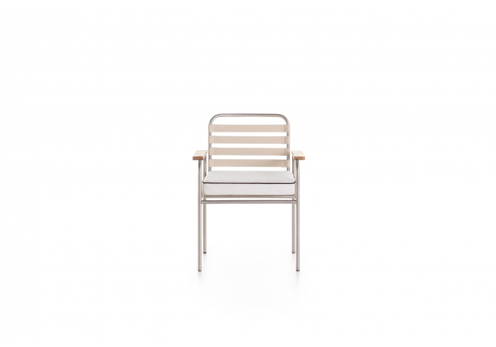 Onsen Chaise conçue par Francesco Meda et David Quincoces pour Gandia Blasco est dotée d'une structure en acier inoxydable avec des accoudoirs en bois d'iroko. Les coussins sont inclus. Disponible en différentes finitions.