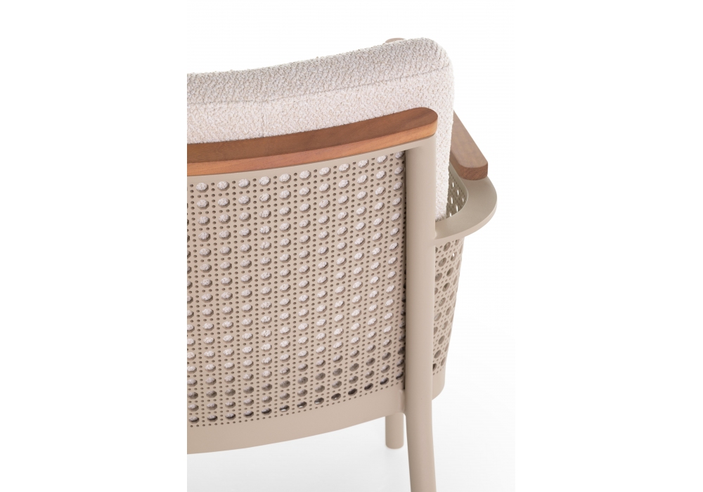 Bosc Chaise conçue par Made Studio pour Gandia Blasco est fabriquée en aluminium thermolaqué, avec des accoudoirs en bois d'iroko et un revêtement en caoutchouc polyuréthane et fibres de polyester imperméables, idéale pour les espaces extérieurs. Coussins inclus. Disponible en plusieurs finitions.