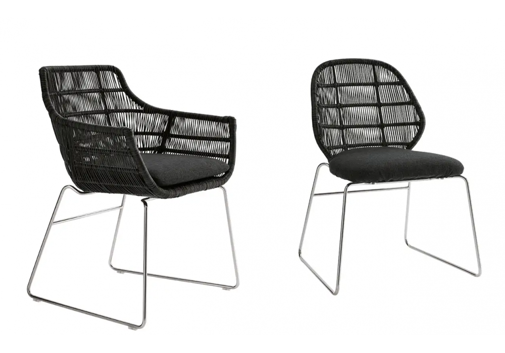 Crinoline conçue par Patricia Urquiola pour B&B Italia Outdoor est une chaise avec structure en aluminium verni à poudre polyester tortora, tressage en polyéthylène tortora et base en acier inoxydable. Coussin assise et dossier avec revêtement en tissu.