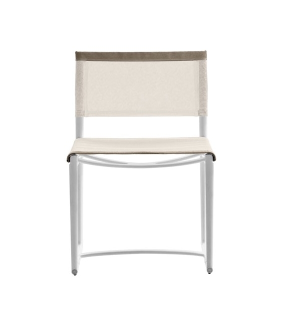Mirto conçue par Antonio Citterio pour B&B Italia Outdoor est une chaise avec structure en aluminium moulé sous pression et extrudés avec peinture polyuréthane, assise et dossier en maille Stige en Batyline® Canatex de couleur blanc ou tortora et bords en Batyline® Keops, couleur tortora.