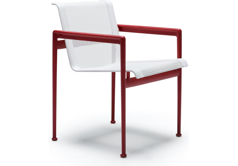 1966 conçue par Richard Schultz pour Knoll est une chaise de salle à manger avec accoudoirs avec une structure en aluminium extrudé et moulé sous pression avec peinture polyester résistante aux intempéries. Revêtement en maille tressée en fibre polyester blanche ou couleur onyx. Bord en matière synthétique.
