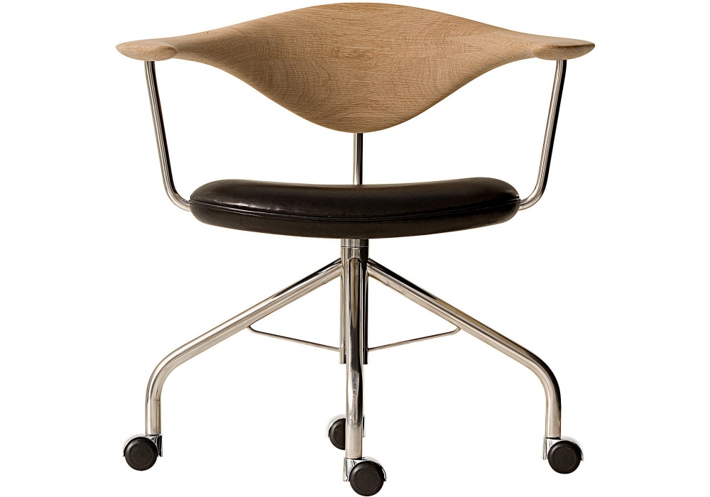 The Swivel Chair is an uncompromising tool with comfort and ergonomics as overriding considerations. In actual fact, it is a continuation of pp501/pp503 The Chair, which marked a turning point, not just for Wegner but also for Danish Design in general. The top bar, made of solid wood and twisted like a propeller, is separated from the remaining frame and completed at the very limit of what is possible for full ergonomic advantage.