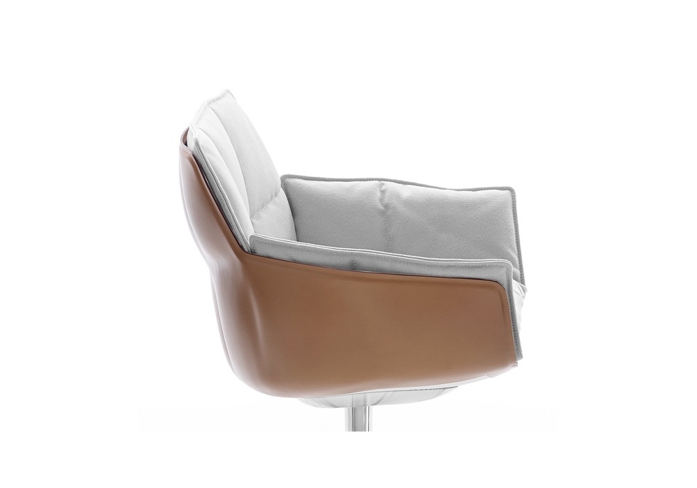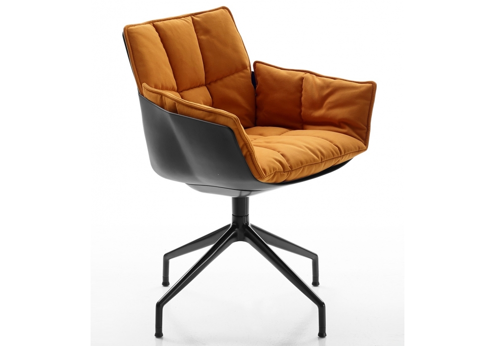 Husk conçue par Patricia Urquiola pour B&B Itali, est une chaise sur tréteau avec base en fonte d'aluminium brossé, peint en blanc ou peint en noir. Coque en résine polyuréthane haute densité (Baydur®) de couleur blanche, anthracite, marron ou gris tourterelle ou cuir. Revêtement en tissu ou cuir.