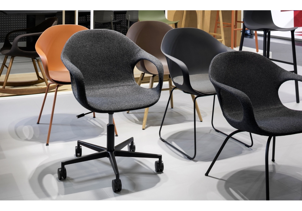 Elephant conçu par Neuland. Paster & Geldmacher pour Kristalia est un petit fauteuil à roulettes composé d'une coque revêtue de cuir ou de tissu et d'une base en aluminium. Disponible en différentes finitions.