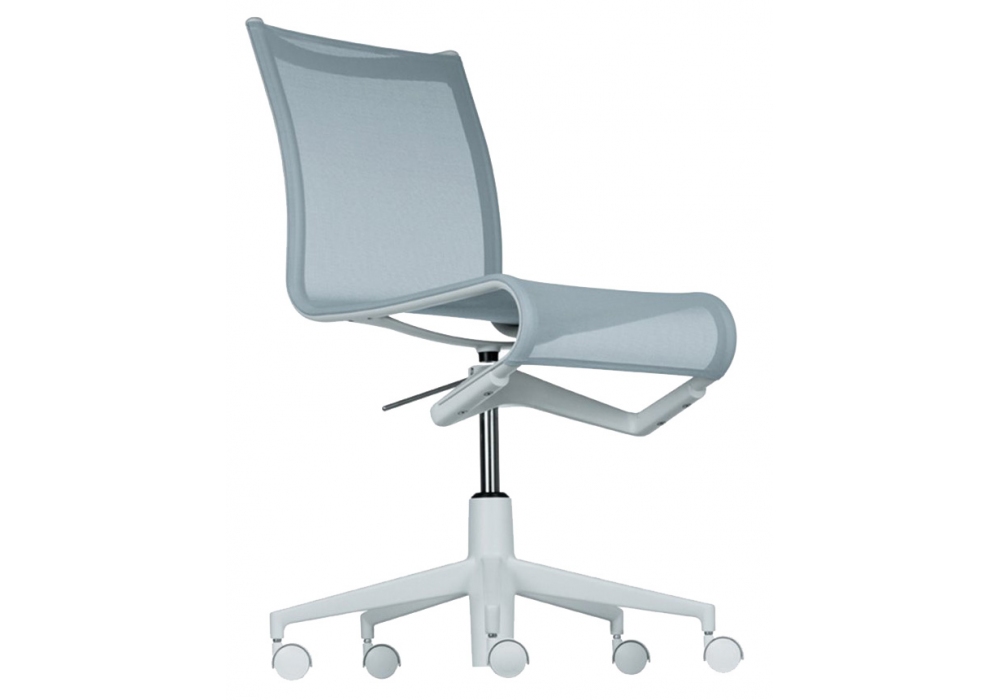 432 Rollingframe 44 conçu par Alberto Meda pour Alias est une chaise, piètement à 5 branches avec roues dures ou souples, structure en aluminium extrudé, assise et dossier en filet ignifuge en polyester ou recouvert de Pelle Frau ou de Kvadrat. Disponible en différentes finitions.