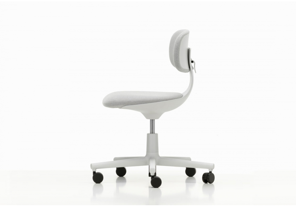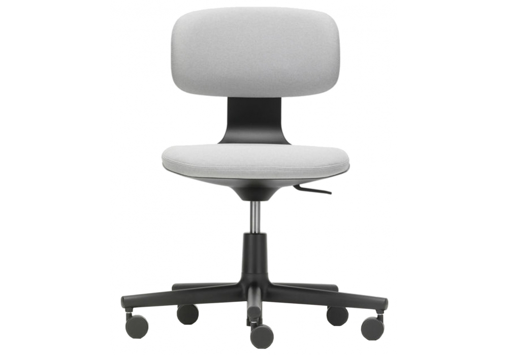 Rookie conçue par Konstantin Grcic pour Vitra est une chaise pivotante avec coque et piètement à cinq branches en polyamide en couleurs soft grey ou deep black; roulettes doubles (Ø 60 mm) en basic dark. Revêtement disponible en tissu ou cuir. Hauteur ajustable.