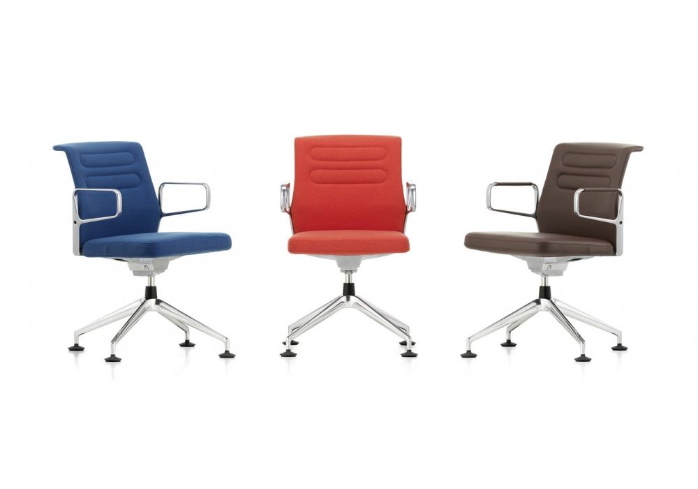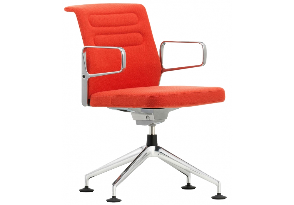 AC 5 Meet conçu par Antonio Citterio pour Vitra est une chaise de conférence pivotante. L'assise et le dossier sont en tissu ou en cuir et la base à quatre branches en aluminium moulé sous pression sur les glissières. Disponible avec et sans accoudoirs. Les mesures sont conformes à la norme EN 1335-1.