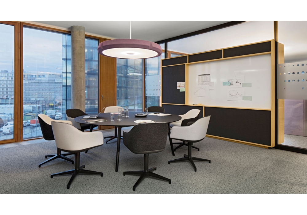 Softshell Chair conçue par Ronan & Erwan Bouroullec pour Vitra est une chaise à base à quatre branches réalisée avec un rembourrage d'assise et de dossier en mousse de polyuréthane, un revêtement en tissu ou en cuir et une base en aluminium. Disponible en différentes finitions.