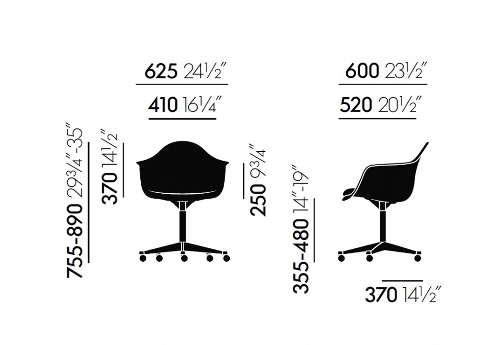 La Eames Plastic Armchair est disponible avec des piètements pour une utilisation en tant que siège pour visiteur, siège pour manger, siège pivotante et fauteuil à bascule. Montage sur traverse possible pour les espaces d’attente.