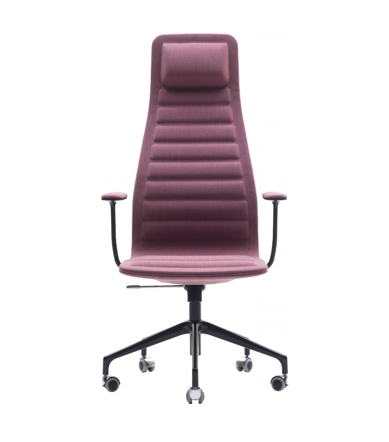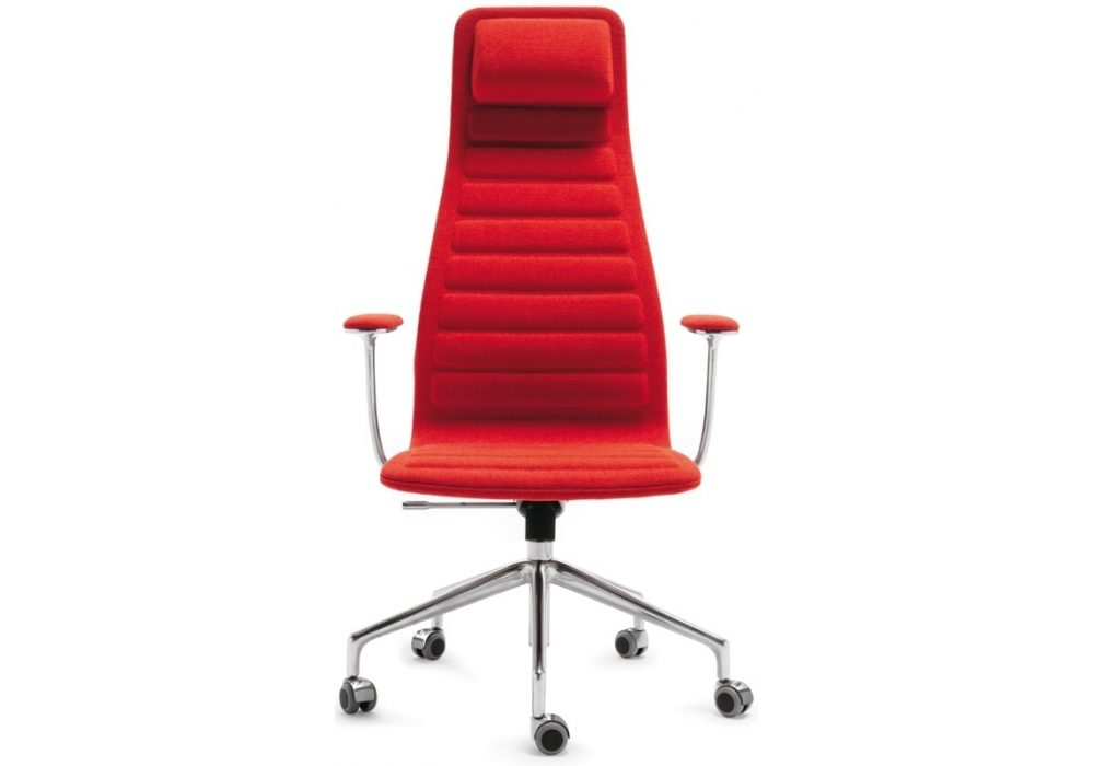 Lotus (High) conçue par Jasper Morrison pour Cappellini est une chaise de bureau pivotante inclinable à hauteur variable réalisée avec une base à 5 branches en aluminium moulé sous pression sur roues, un rembourrage en mousse de polyuréthane à densité différenciée et un revêtement fixe en tissu ou en cuir. Disponible avec ou sans accoudoirs.