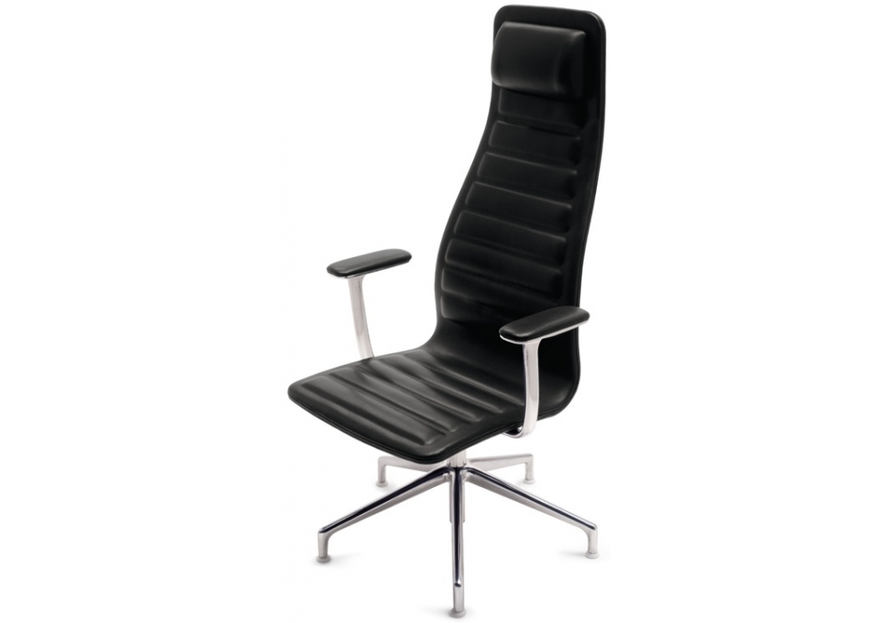 Lotus (High) conçue par Jasper Morrison pour Cappellini est une chaise de bureau pivotante inclinable à hauteur variable composée d'une base à 5 rayons en aluminium moulé sous pression, d'un rembourrage en mousse de polyuréthane à densité différenciée et d'un revêtement fixe en tissu ou en cuir. Disponible avec ou sans accoudoirs.