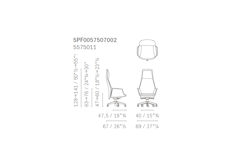Downtown President conçu par Jean Marie Massaud pour Poltrona Frau est une chaise pivotant doté d’une structure en mousse de polyuréthane moulée avec insert métallique et d’un rembourrage à densité différenciée, matelassé de ouate de polyester. Le piètement à cinq branches est disponible en aluminium poli ou peint en noir, avec des roulettes souples à freinage automatique ou des patins. Le revêtement est disponible en cuir Pelle Frau® (également disponible avec des parties micro-perforées sur demande) ou en tissu. Le siège offre une rotation à 360°, un réglage de la hauteur d'assise, ainsi qu'un mécanisme synchronisé d'inclinaison et d'oscillation du dossier avec réglage de la résistance.