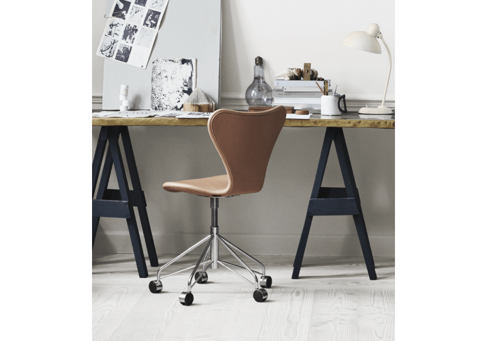 Series 7 conçue par Arne Jacobsen pour Fritz Hansen est une chaise pivotante réalisée avec une coque entièrement recouverte de tissu ou de cuir et une base à 5 branches avec roulettes en tube d'acier chromé.