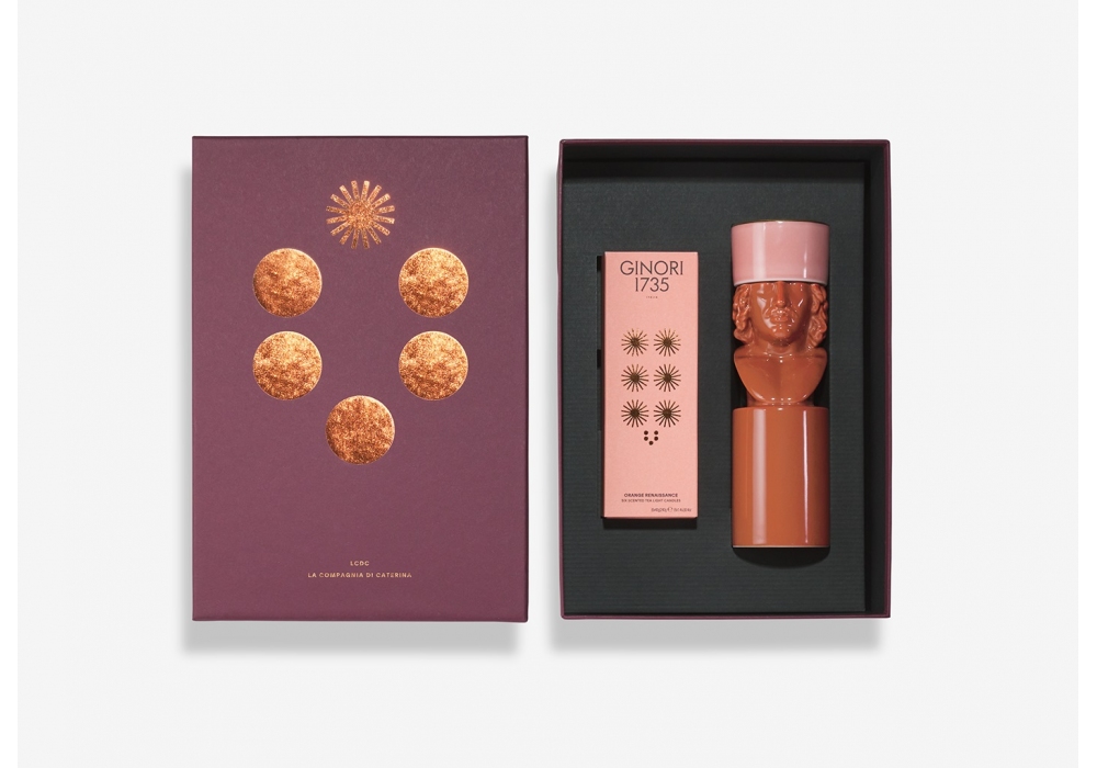 LCDC Il Letterato Red Clay conçu par Luca Nichetto pour Ginori 1735 est un bougeoir rechargeable en porcelaine avec 6 bougies parfumées Orange Renaissance de 40 g.