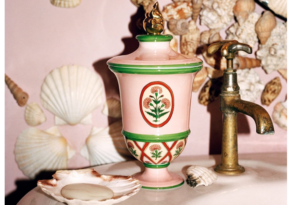 Anfora Rajathra Palace conçue par Luke Edward Hall pour Ginori 1735 est une bougie parfumée design pour intérieurs au corps en pure porcelaine décorée.