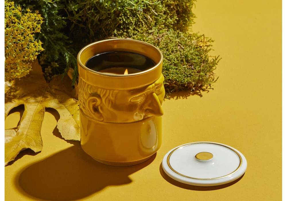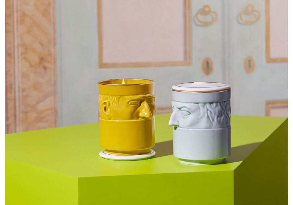LCDC Il Seguace Saffron conçu par Luca Nichetto pour Ginori 1735 est un bougeoir rechargeable en porcelaine avec un ensemble de bougies parfumées Amber Lagoon de 190 g avec couvercle.