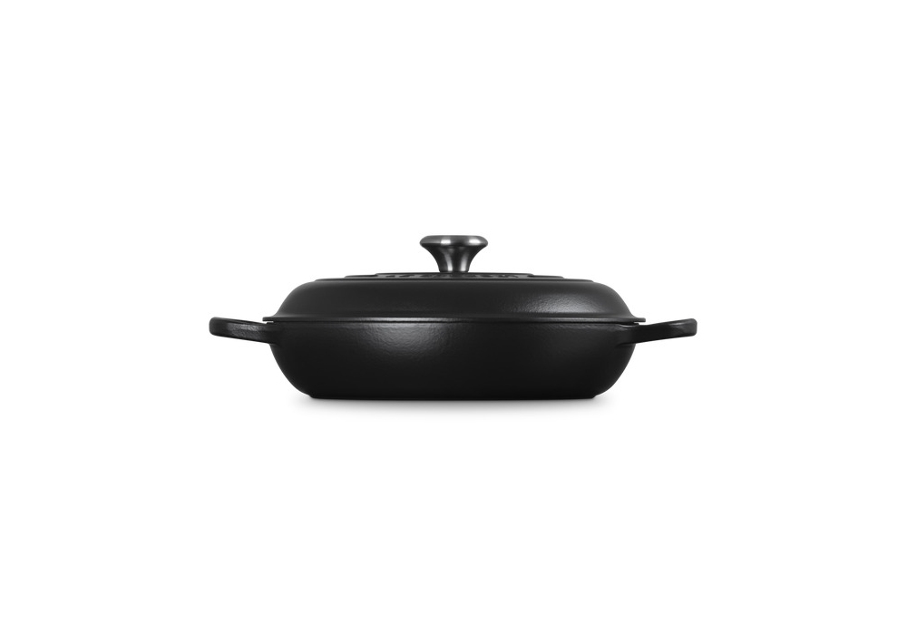 Tegame Basso Rotondo Evolution 30 conçu par Le Creuset est une cocotte basse ronde en fonte, intérieur noir.