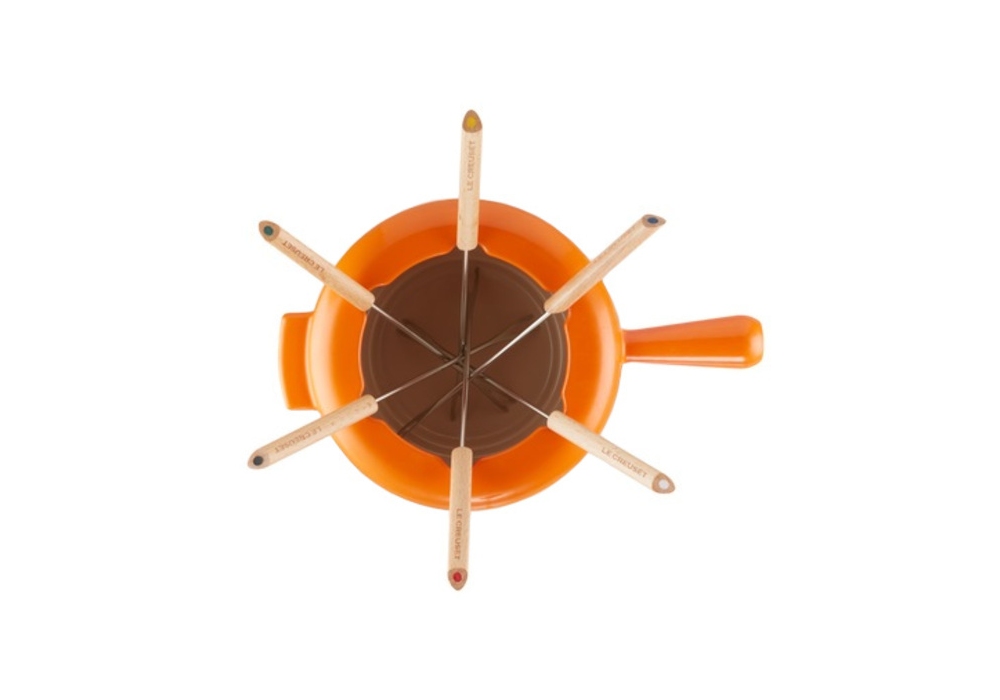 Set Fonduta Savoiarda conçu par Le Creuset est un caquelon à fondue avec poignées et pare-éclaboussures, un petit réchaud et six fourchettes. Disponible en différentes couleurs.
