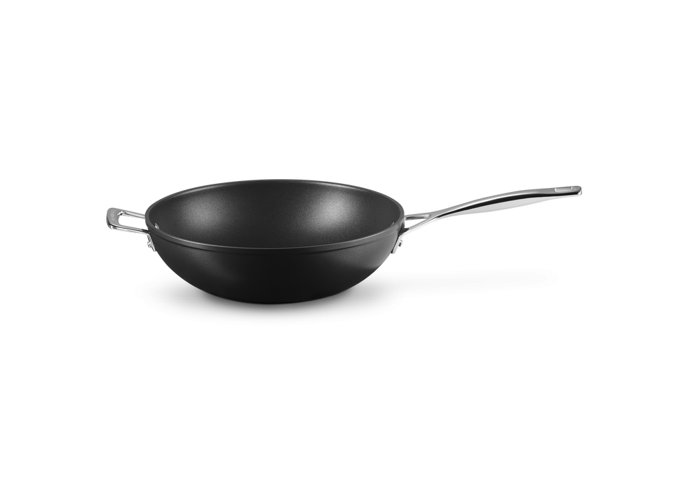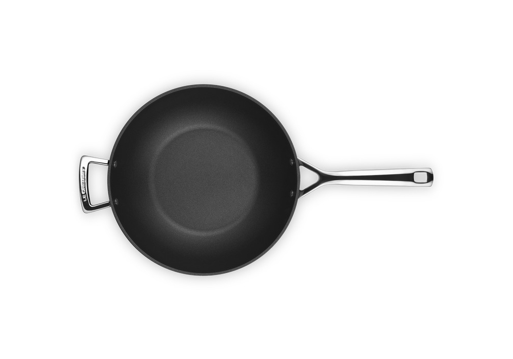 Padella Wok con Manico Lungo e Maniglia 30 conçue par Le Creuset est une poêle en aluminium antiadhésive avec une longue poignée et une poignée.