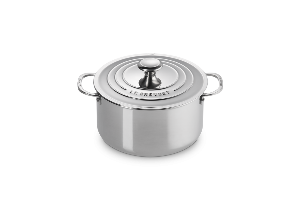 Batteria 5 Casseruole conçu par Le Creuset est un ensemble de 5 cocottes en acier inoxydable. L'ensemble se compose de 3 casseroles hautes, 1 casserole basse et 1 casserole avec manche long.