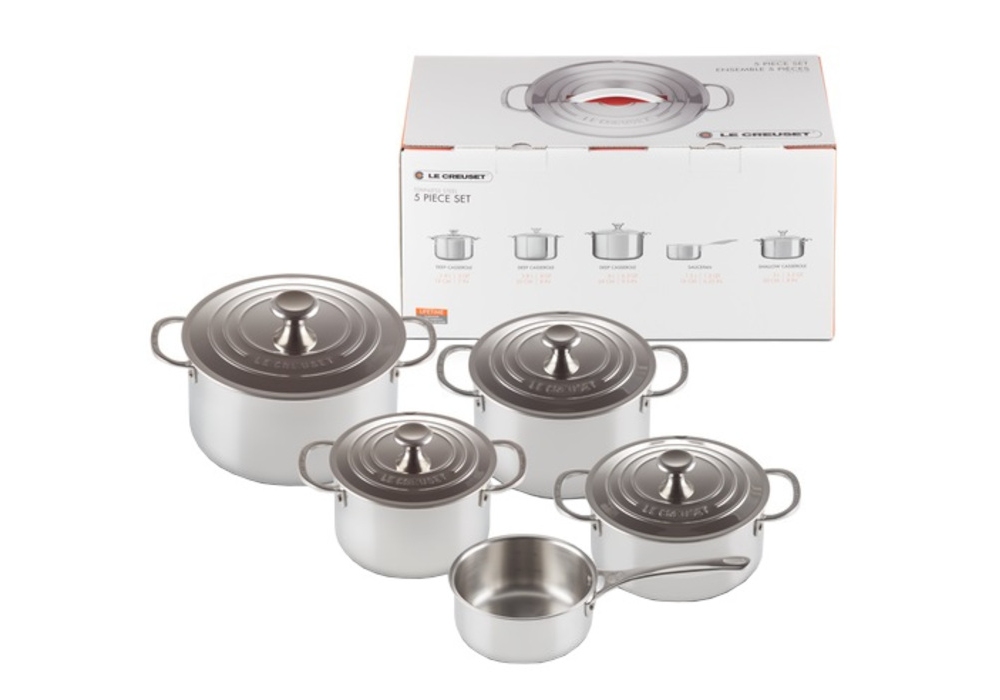 Batteria 5 Casseruole conçu par Le Creuset est un ensemble de 5 cocottes en acier inoxydable. L'ensemble se compose de 3 casseroles hautes, 1 casserole basse et 1 casserole avec manche long.