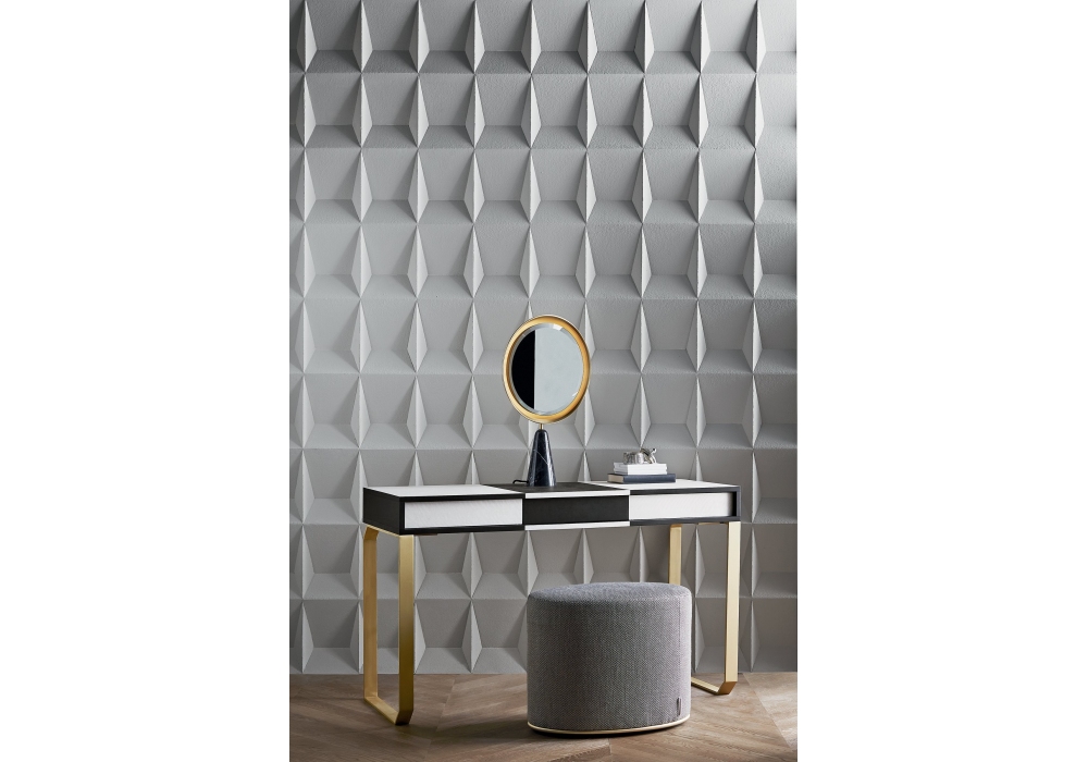 Selene conçue par Pietro Russo pour Gallotti & Radice est une coiffeuse en bois Taba Frisé blanc et Tanganika noir. Parties métalliques laquées laiton satiné. Miroir extralight 6mm biseauté. Doué de lumière LED (15 watt; 108lm/w; 3000k). Parties métalliques en laiton satiné et piètement en marbre Nero Marquinia.