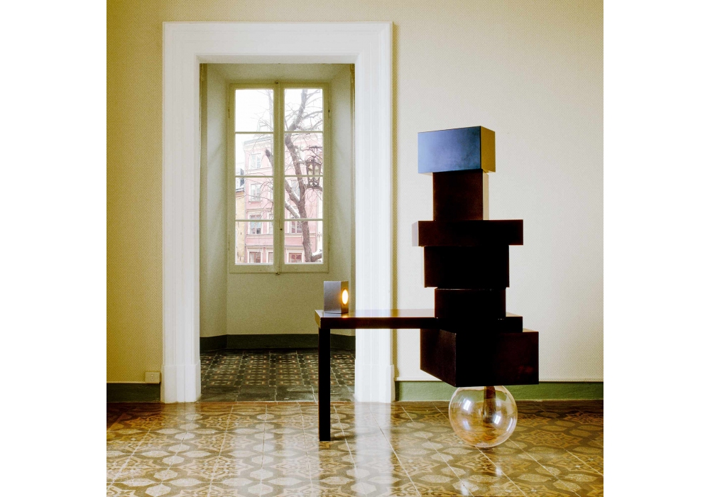 Pauline conçue par Bill Woodrow pour Memphis Milano est une coiffeuse avec tiroir et portes en bois laqué noir avec sphère en plexiglas et lampe rechargeable. Édition limitée de 25 pièces.