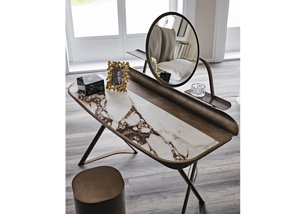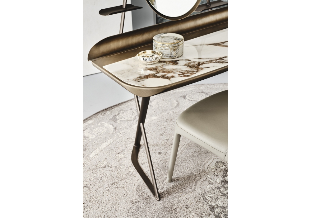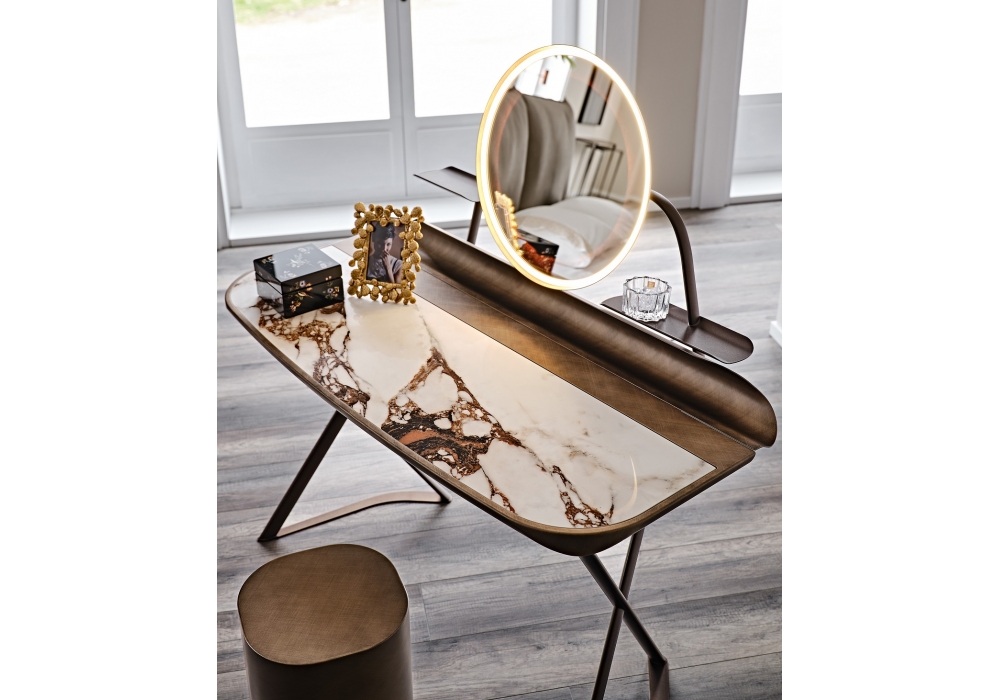 Cocoon Trousse Keramik conçue par Paolo Cattelan pour Cattelan Italia est une Coiffeuse réalisée avec une base en acier verni. Plateau en céramique Marmi en plusieurs coloris avec profil inférieur arrondi laqué Brushed Bronze ou Brushed Grey et plateau rainuré lacqué Brushed Bronze ou Brushed Grey. Miroir avec structure en acier lacqué avec supports latéraux et étagères en acier lacqué et éclairage à led.