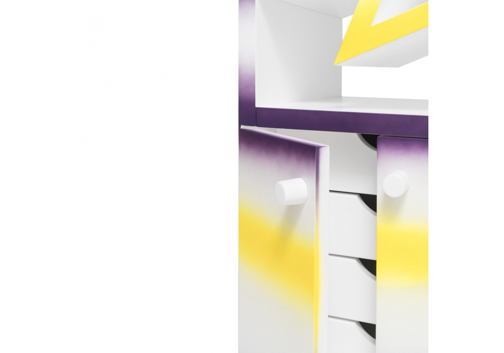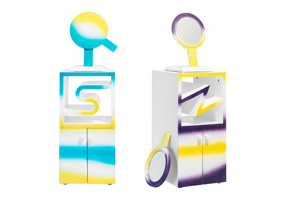 Fuji conçue par Michael Graves pour Memphis Milano est une coiffeuse en bois laqué et sérigraphié équipée d'un miroir fixe et mobile.