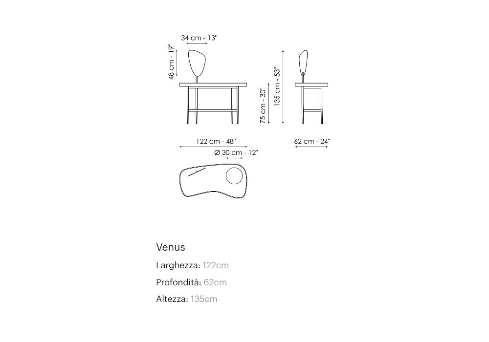 Venus conçue par Marconato et Zappa pour Bonaldo est une coiffeuse disponible en deux combinaisons de couleurs. La structure est en métal et le plateau en céramique. Le bord du plateau et le plateau sont en noyer canaletto.