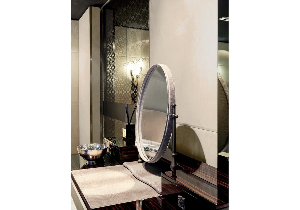 Charlize conçue par Giuseppe Viganò pour Longhi est une table de maquillage en bois ou laqué brillant et structure en métal tourné. Dessus de bureau et tiroirs intérieurs en différentes finitions de cuir. Poignées en marbre ou en cuir. Cadre et base du miroir recouverts de différentes finitions en cuir.