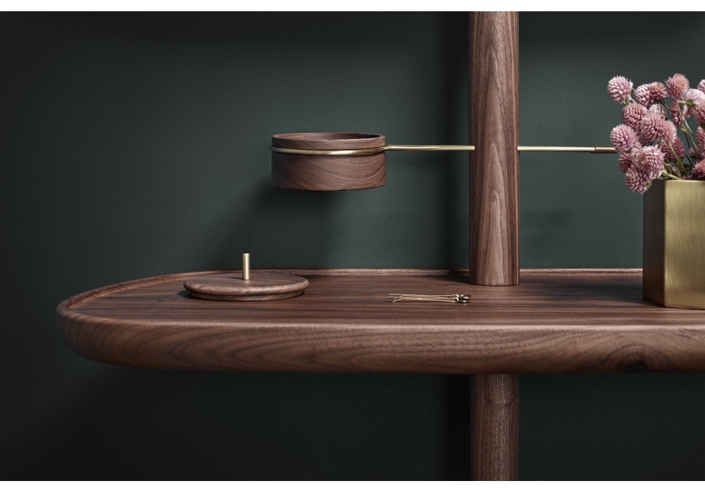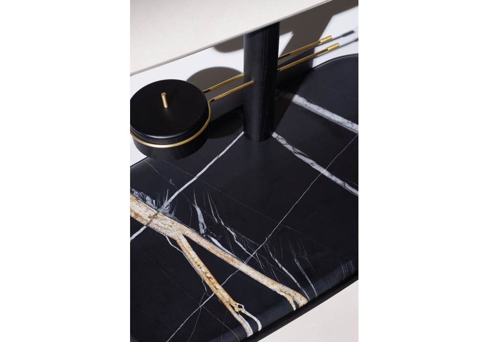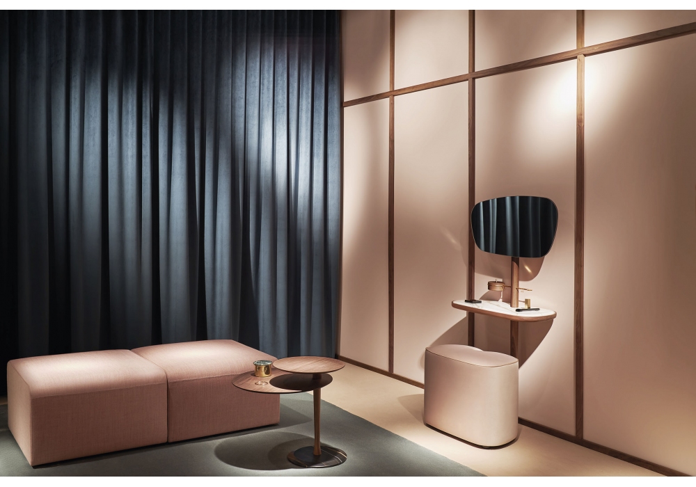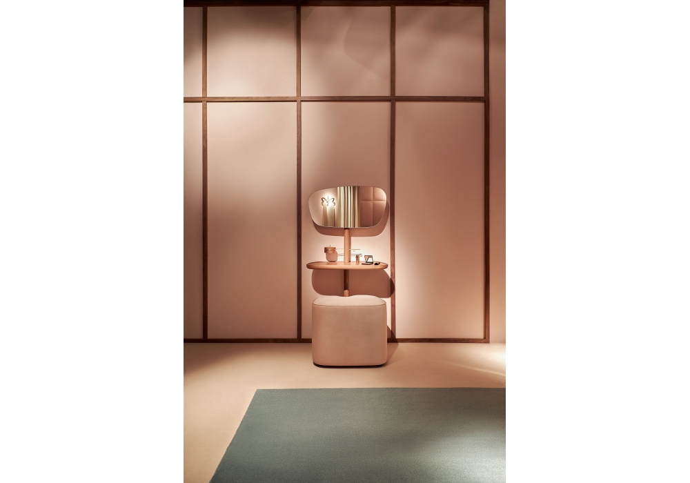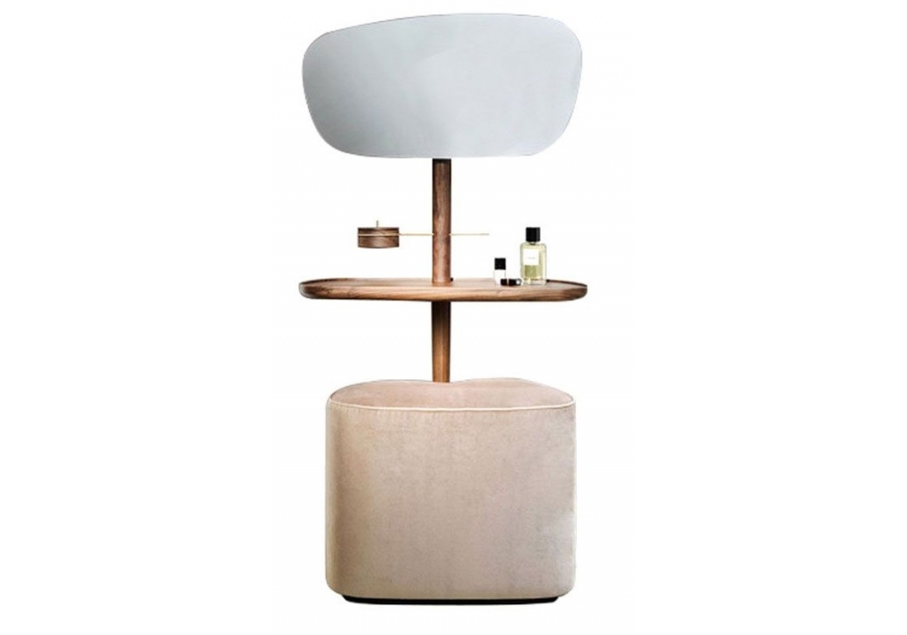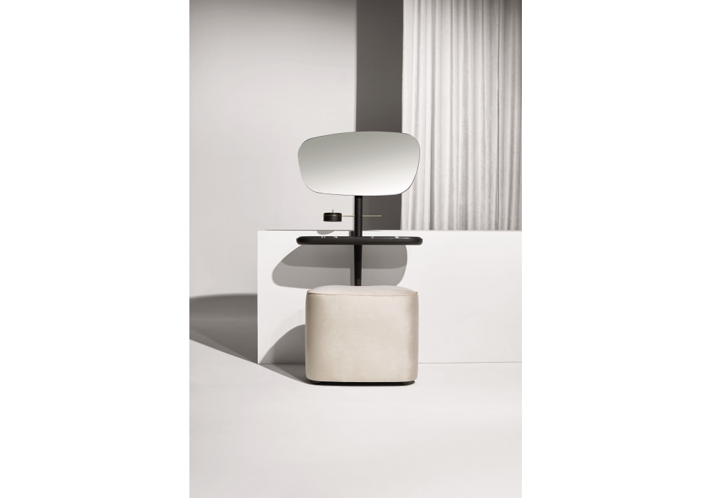 Tocador conçue par Andrés Martinez pour Nomon est une coiffeuse avec structure en noyer naturel ou finition frêne noir, plateau en noyer ou marbre en différentes finitions. Le pouf assorti est recouvert de velours, en 3 finitions.